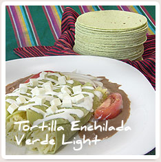 Tortilla de maíz que ya tiene integrados los ingredientes para preparar deliciosas enchiladas verdes bajas en calorías. El peso de cada tortilla es de 20-22 gramos.